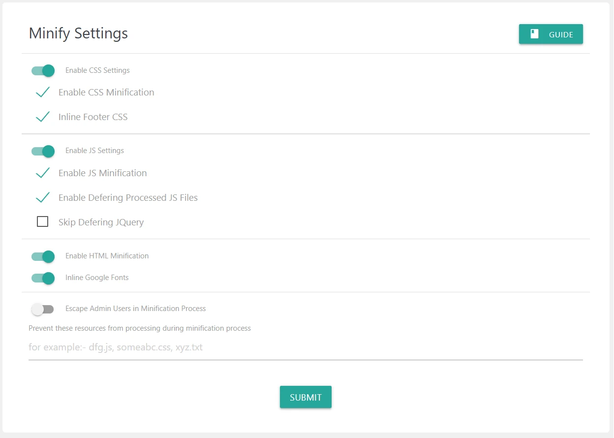 Prevent these resources from processing during minification process: There will be chances that some of files are important to theme and plugins you are using and if we add them to minifaction process it will brake UI of website so we need to avoid them during minification process. You need to comma seprated list of files to prevent them processing during minification process.