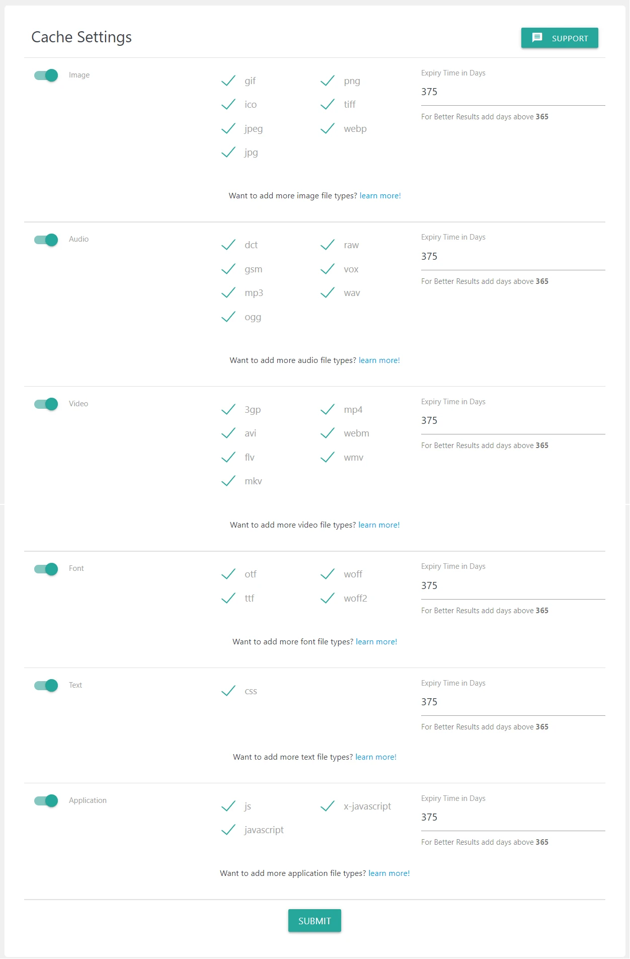 Plugin offers certain advance settings which help you to enhance speed of page if used in proper way. In this section of plugin settings you can also add more type of files for adding expire header in cache settings.