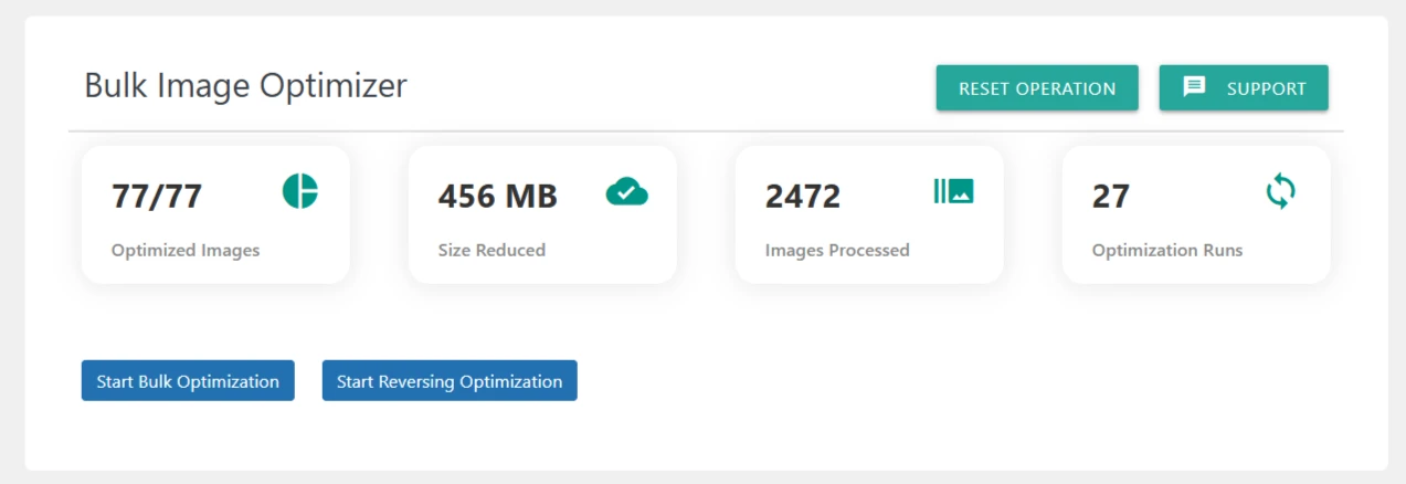 Displays the total number of images optimized out of the total available. For example, 77/77 means all uploaded images have been optimized successfully. This helps you monitor progress during large-scale optimizations or reversals. The counter updates in real time as images are processed, ensuring you can track exactly how many have been completed versus pending.